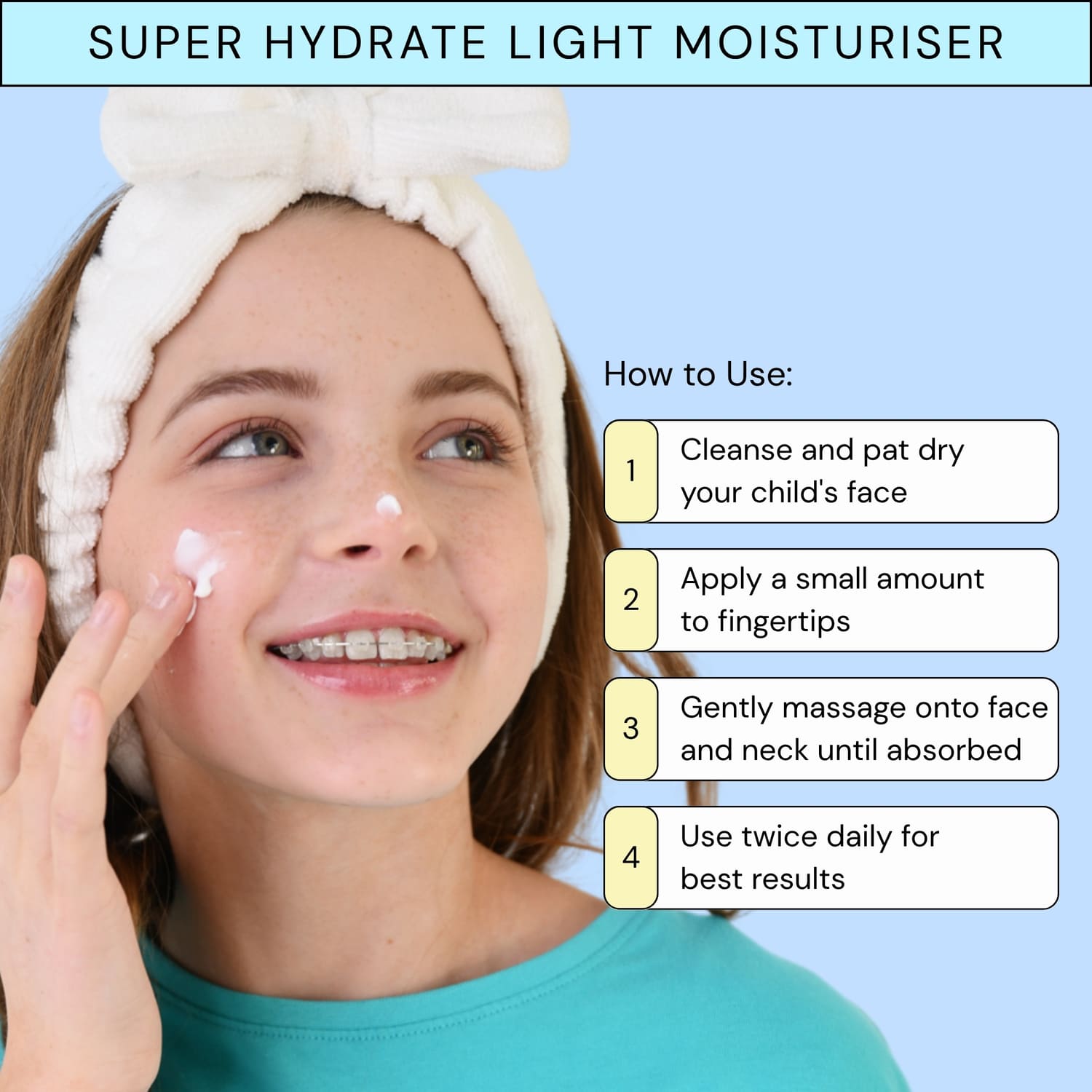 The Super Hydrate Light Moisturiser is specially crafted for kids' delicate skin, delivering a lightweight, non-greasy hydration. With its refreshing, cooling effect and natural ingredients, it leaves the skin feeling soft, smooth, and gently nourished all day long.